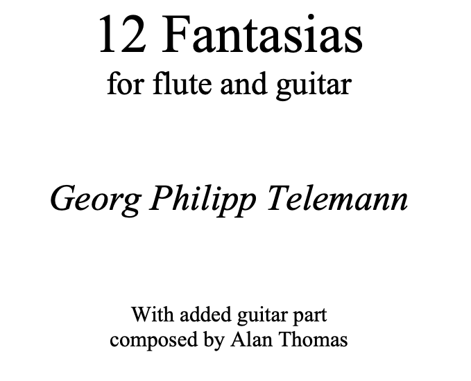 The score and parts for my version of Telemann's Flute Fantasias with added guitar part. The work was commissioned by the Cavatina Duo and recorded by them on their "Folias and Fantasias" CD. This is the PDF version of the score and flute/guitar parts. 156 pages